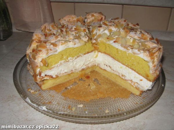 Žloutky, cukr a mášlo ušlehat, přidat mouku, prášek do pečiva a mléko - těsto rozdělit do dvou stejných dortových forem. Ze 4 bílků ušlehat sníh + 22 dkg práškového cukru, opět rozdělit na polovinu a nandat na těsto ve formě a posypat mandlemi a upéct. POZOR změřte si jestli se Vám do trouby vejdou dvě dortové formy najednou. Mně bohužel ne, takže jsem si ingredience rozpočítala a šlehala a pekla postupně na dvakrát - není nutné!!!.